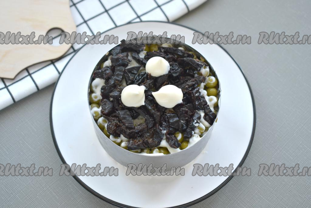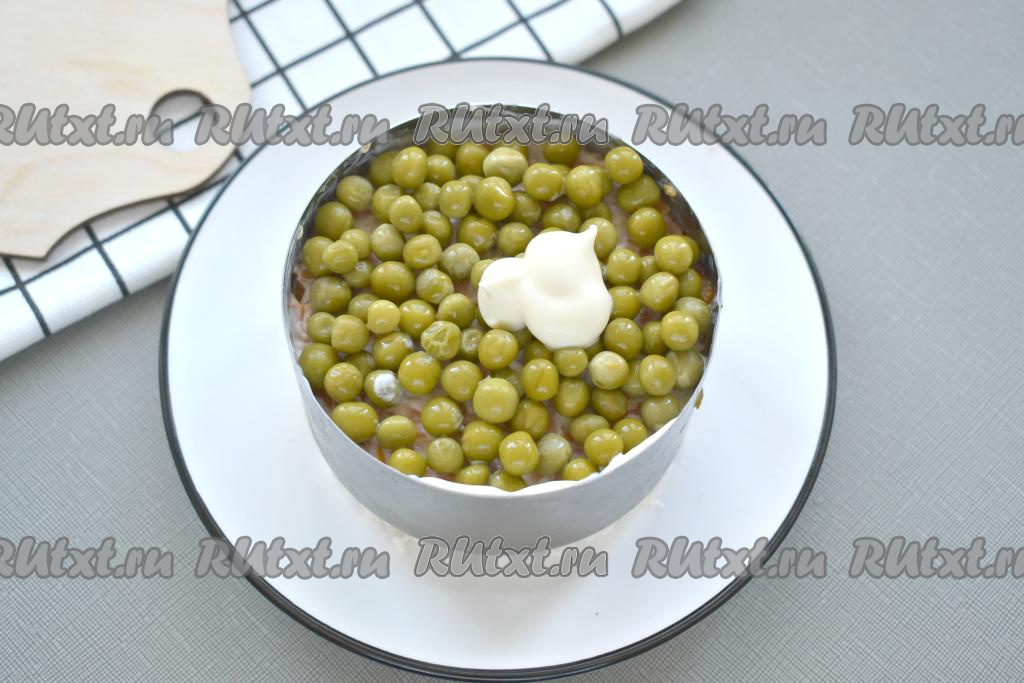Горошек сначала откидываем на сито, чтобы слить с него лишнюю жидкость. Поверх морковки выкладываем 1/3 горошка, немного смазываем майонезом.