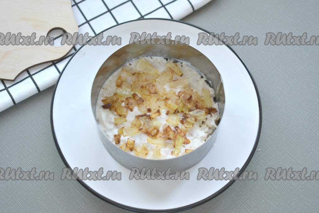 Нарезаем мелко очищенный лук и обжариваем его на сковороде на растительном масле до золотистости (в течение 3-4 минут) на среднем огне, иногда помешивая. Даём луку остыть, выкладываем 1/3 лука на слой из курицы.