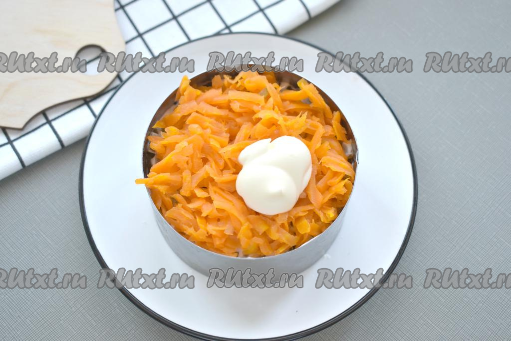 Очищенную варёную морковку натираем на крупной тёрке. Выкладываем 1/3 моркови поверх огурчиков, покрываем майонезом.