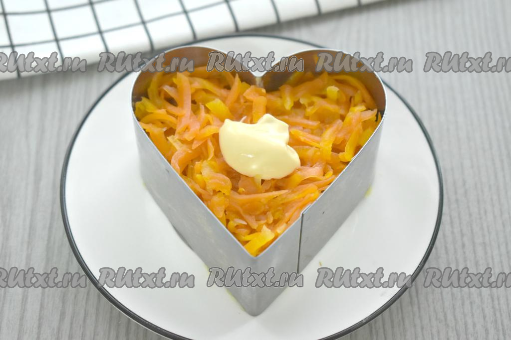Следующим слоем выкладываем натёртую на крупной тёрке морковь. Смазываем морковный слой майонезом.