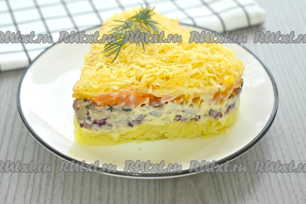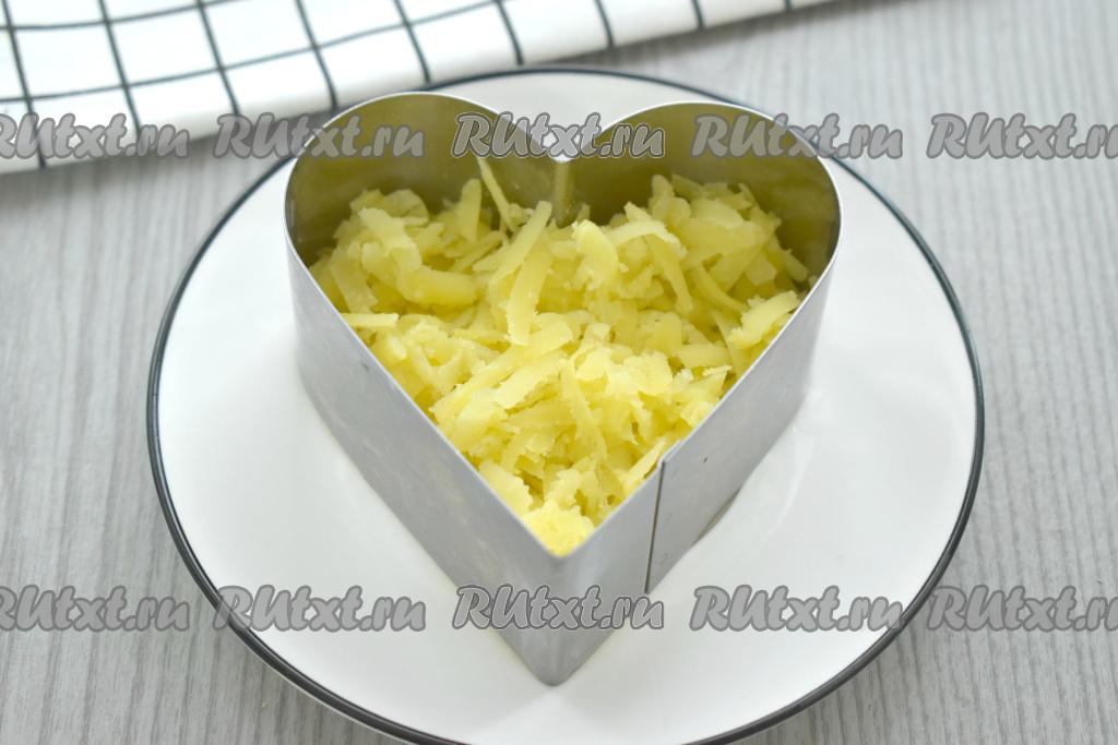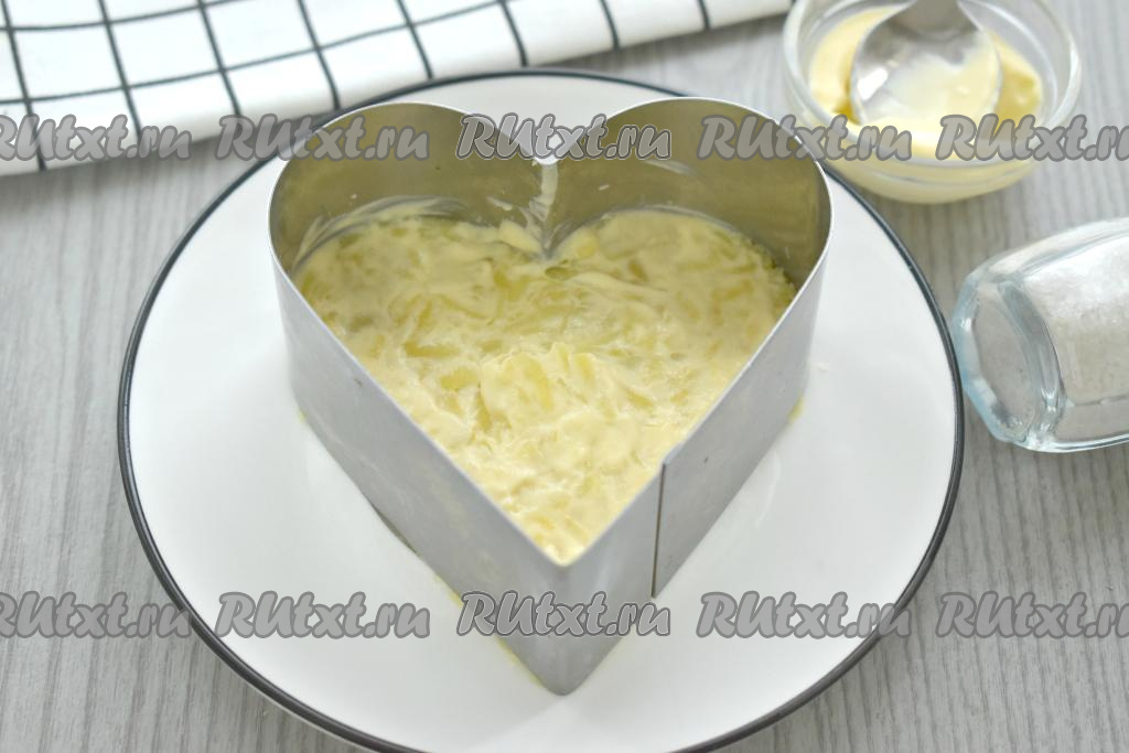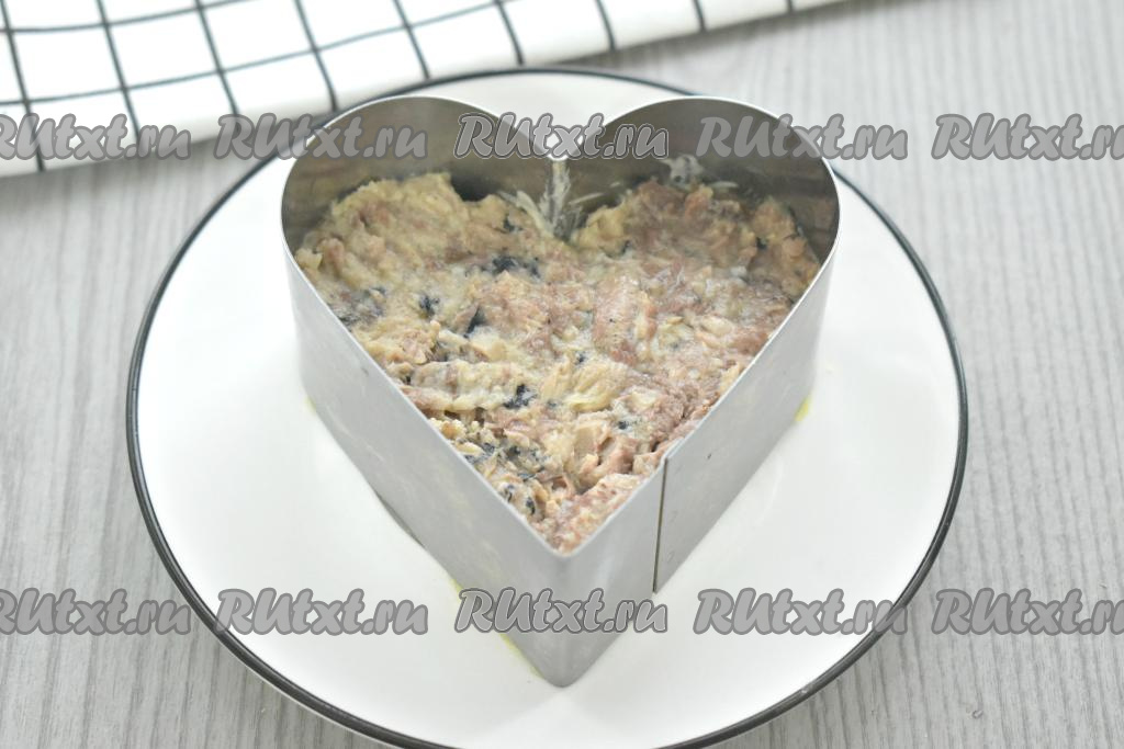 Выкладывать этот салат слоями можно в одной форме. А я решила выкладывать порционно, равномерно распределяя ингредиенты по 2 сервировочным формам "сердце" (приблизительный размер каждой формы около 9-10 сантиметров у широкой стороны).