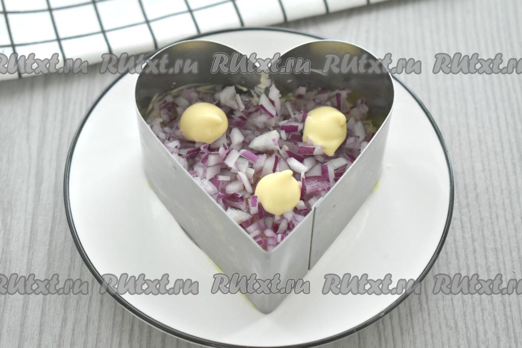 Следующим слоем равномерно распределяем очищенный и мелко нарезанный лук, тоже смазываем его майонезом.