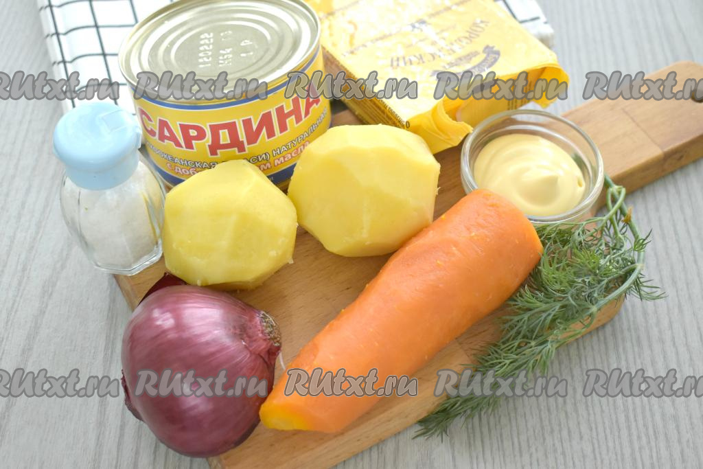 Заранее для салата нужно в кожуре отварить картофель (потребуется примерно 20-25 минут после закипания воды) и морковку (вариться она будет 25-35 минут с момента закипания воды), затем полностью остудить их.