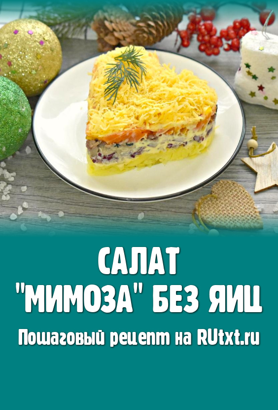 Сытный, сочный и очень вкусный салат "Мимоза", приготовленный без добавления яиц, украсит любое застолье.