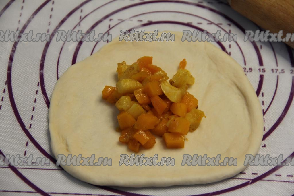 На присыпанной мукой поверхности раскатать одну часть теста в не тонкий круг. В центр круга выложить, примерно, 2 столовых ложки остывшей начинки из тыквы и яблок.