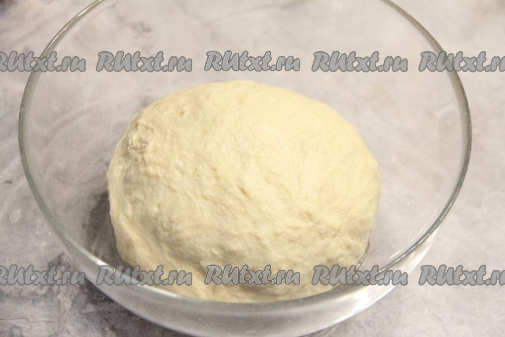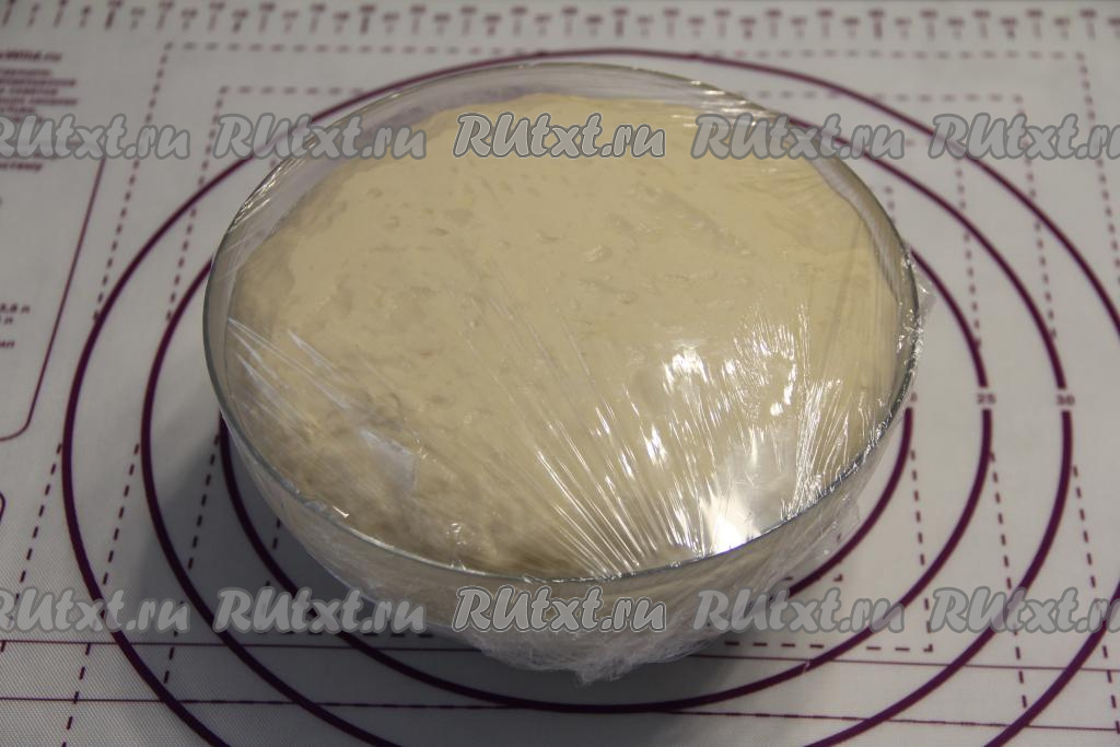 Хорошо вымесить тесто руками в течение 5 минут. Тесто должно получиться мягким, не липнущим к ладоням. Миску с тестом накрыть плёнкой (или полотенцем) и оставить на 1 час в тёплом месте для подъёма.
