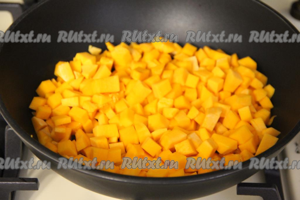 В сковороду со сливочным маслом выложить нарезанную тыкву, обжарить её, периодически помешивая, в течение 7 минут на среднем огне.