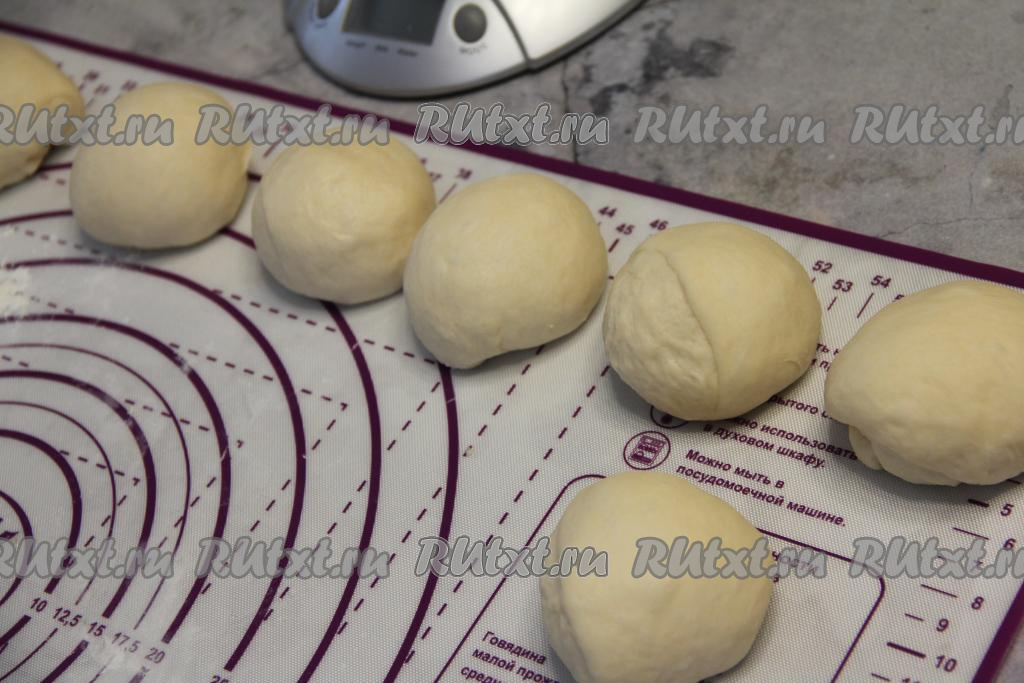 Обмять тесто, разделить его на 8 частей. По желанию, немного теста оставить для украшения. Скатать каждую часть теста в шарик.