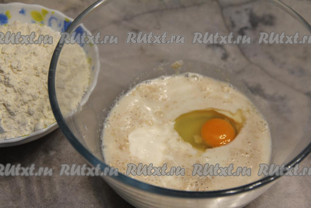 После того как опара запенится, перелить её в объёмную миску, добавить кефир комнатной температуры, яйцо, соль, оставшийся сахар, перемешать.