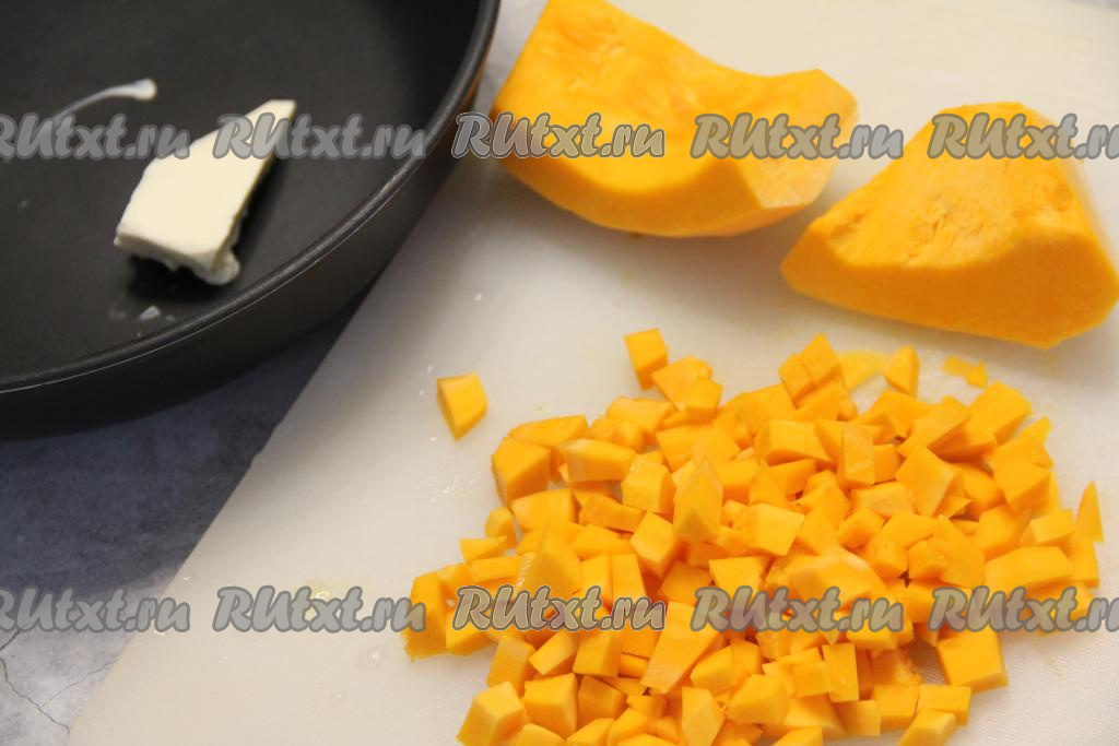 Пока тесто подходит, приготовим начинку. Для этого 300 грамм тыквы, очищенной от семян, волокон и кожуры, нужно нарезать на кубики размером, примерно, 1 сантиметр на 1 сантиметр. В сковороду выложить сливочное масло, поставить на огонь.