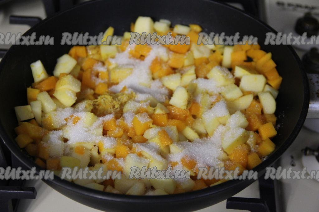 Перемешать тыкву с яблоками, всыпать сахар, томить начинку на огне ниже среднего минут 10 (до мягкости тыквы и яблок), снять с огня, дать остыть.
