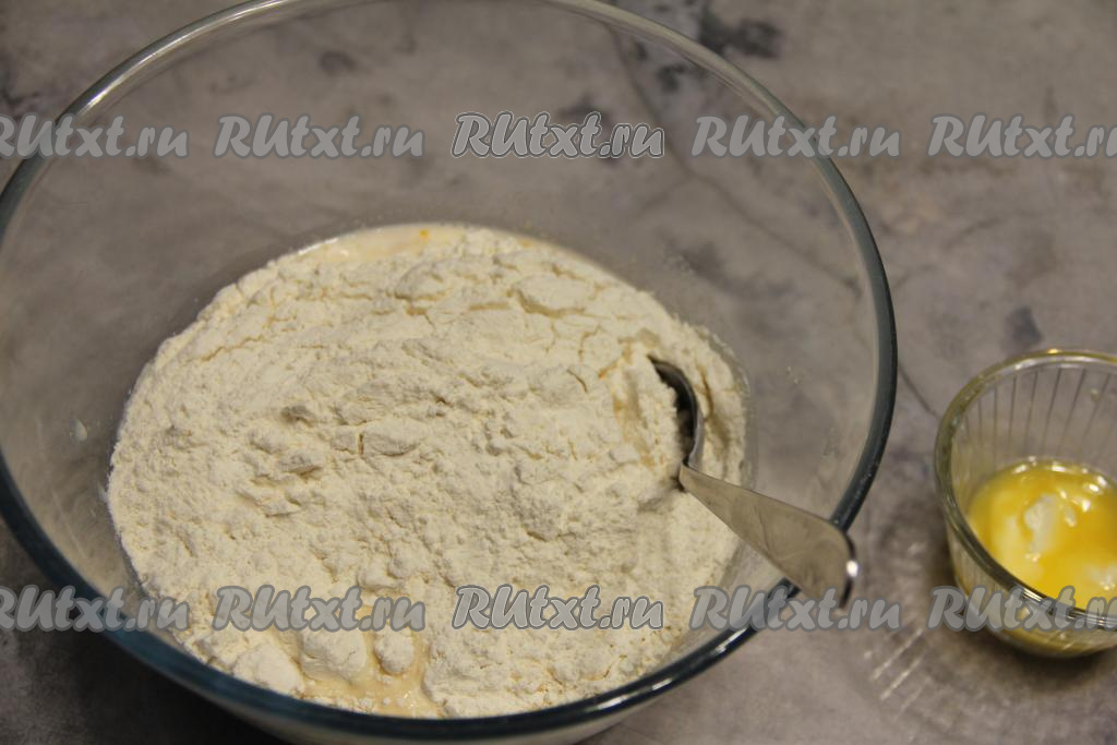Всыпать муку и перемешать тесто ложкой. Сливочное масло растопить (до жидкого состояния его можно не растапливать), дать ему немного остыть.