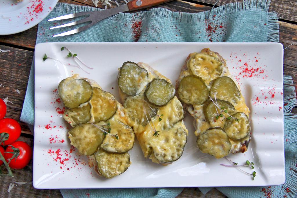 Недавно запекла кусочки свинины с солёными огурцами и сыром в духовке. Попробовав запечённое мясо, была поражена, насколько вкусным и нежным оно получилось. Солёный огурчик придал свинине приятную кислинку и аромат. Использовать лучше именно бочковые огурцы, а не маринованные. Уверена, это блюдо вряд ли кого-то разочарует!