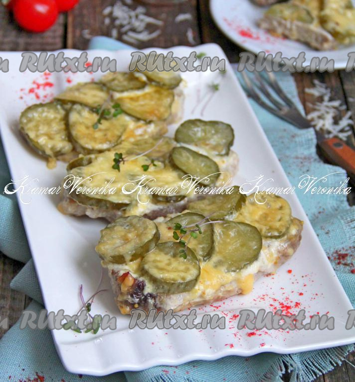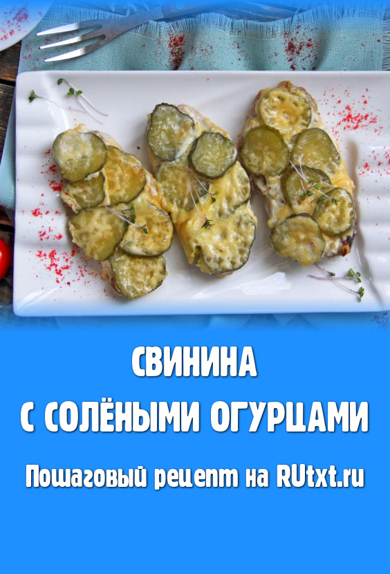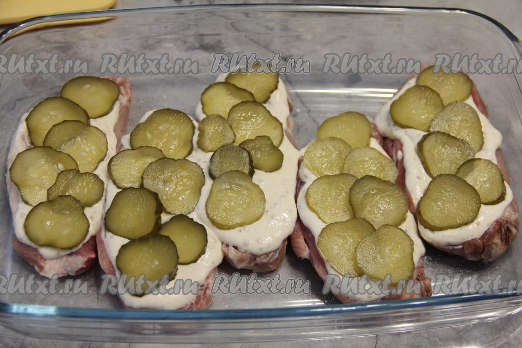 Солёные огурцы нарезать на тонкие кружочки и выложить поверх свинины.
