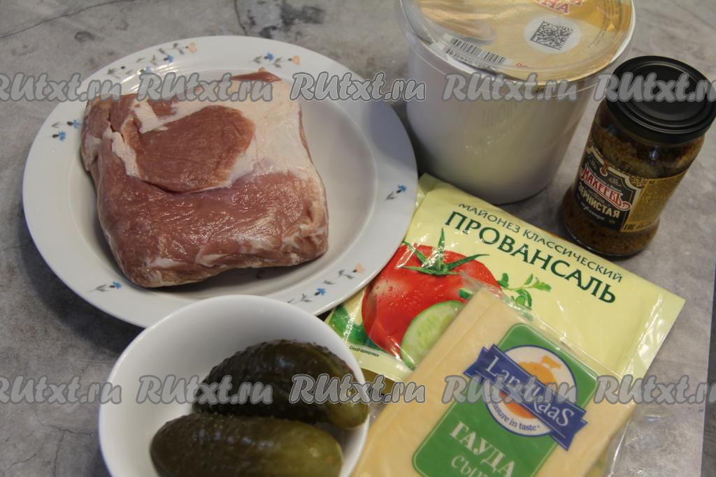 Накрыть форму фольгой и отправить в разогретую духовку. Запекать свинину с солёными огурцами 40 минут при температуре 200 градусов. Мясо даст сок, сыр расплавится, сырной шапки не образуется, но зато получится прекрасный соус.