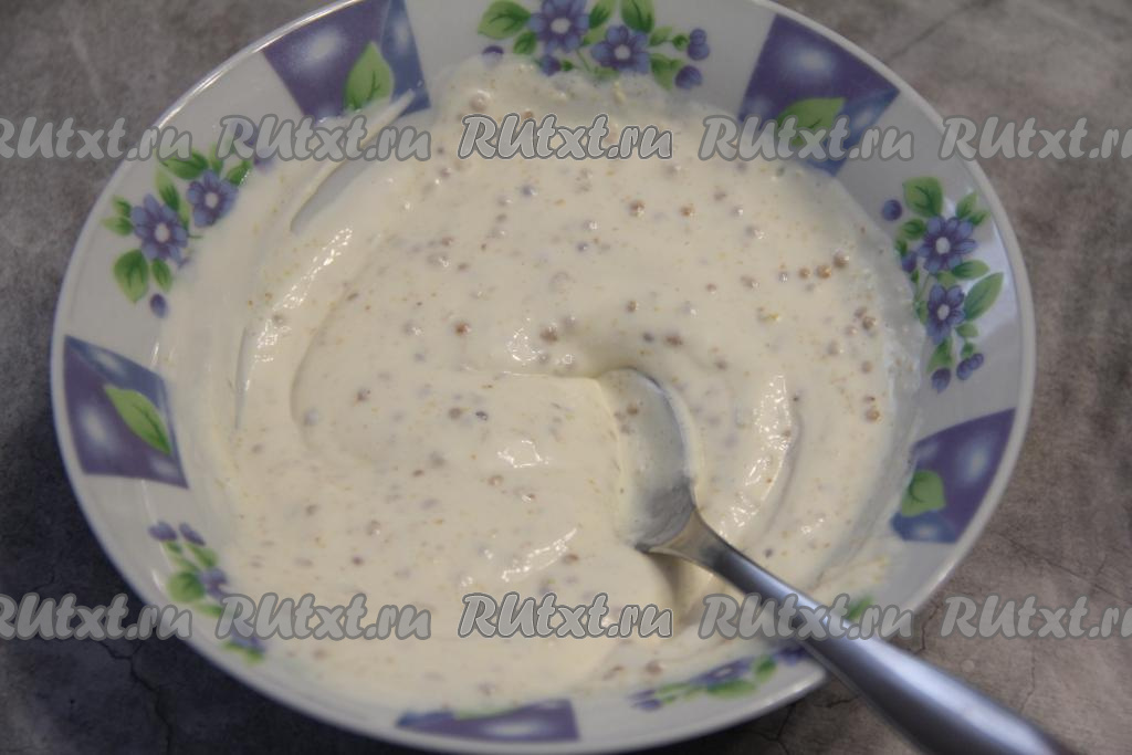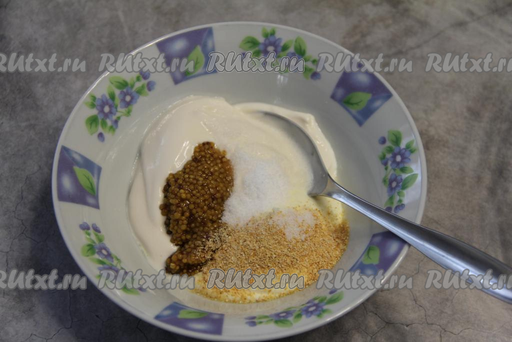 Для приготовления маринада соединить сметану, майонез, соль, горчицу и сушёный (или пропущенный через пресс) чеснок.