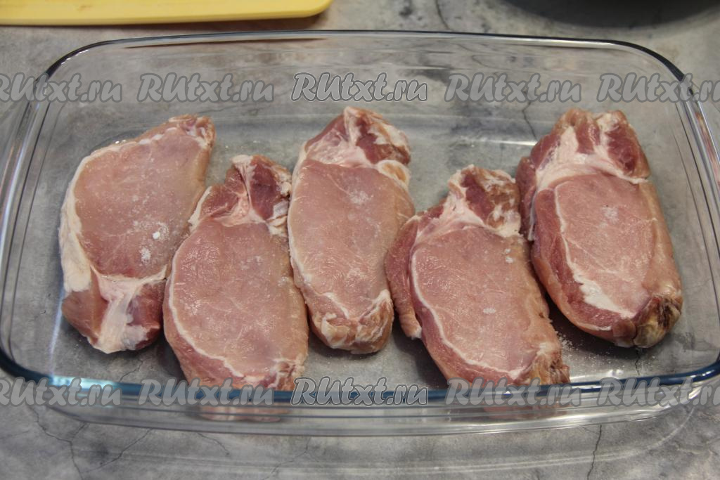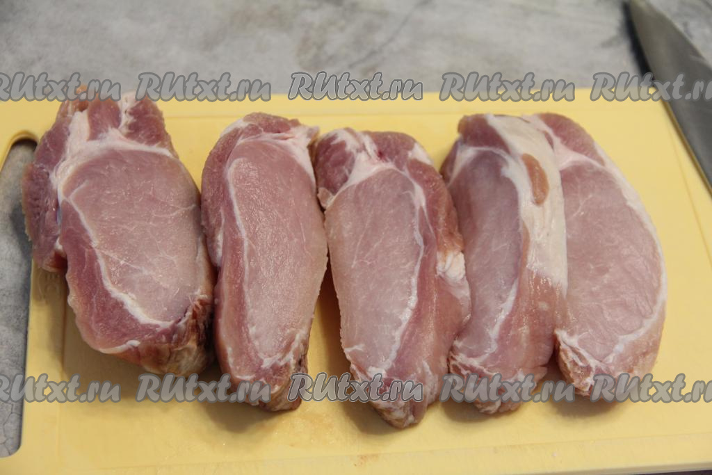 Нарезать свинину на кусочки толщиной 1,5 сантиметра.