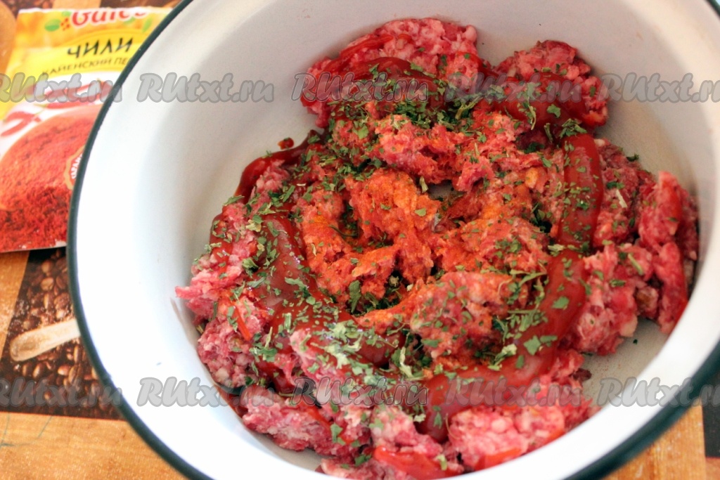 Для приготовления начинки для турецкой пиццы очистите от кожицы помидоры, измельчите (или используйте готовый томатный соус) и соедините с фаршем, мелко рубленными петрушкой и перцем чили, тщательно перемешайте.