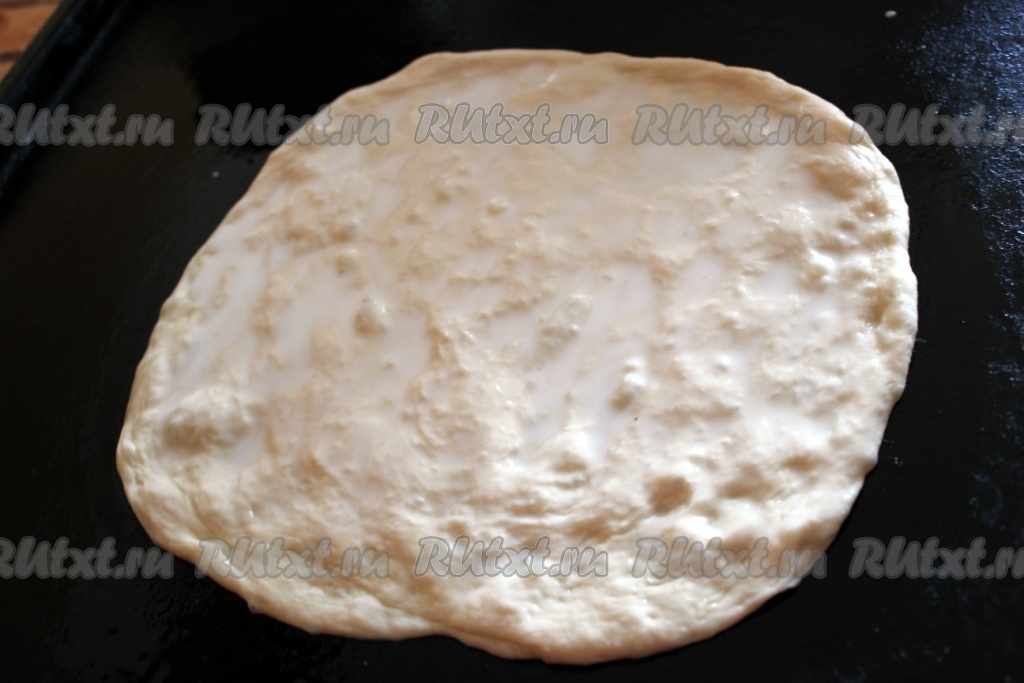 Разделите тесто на 4 части и раскатайте каждую в тонкую лепешку. Смажьте поверхность теста молоком и выложите на противень.