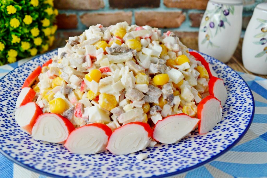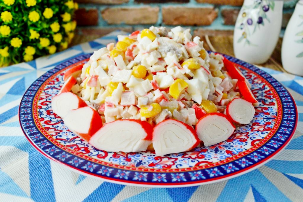 Хочу поделиться очень вкусным и лёгким в приготовлении салатом из крабовых палочек, яиц, консервированных шампиньонов и кукурузы. Это яркое, достаточно сочное и очень вкусное блюдо можно подать к столу и в будни, и в праздники. Для того чтобы этот крабовый салат с грибами получился более нежным, ингредиенты нужно нарезать на мелкие кубики. Приготовьте этот аппетитный салат и насладитесь его приятным вкусом!