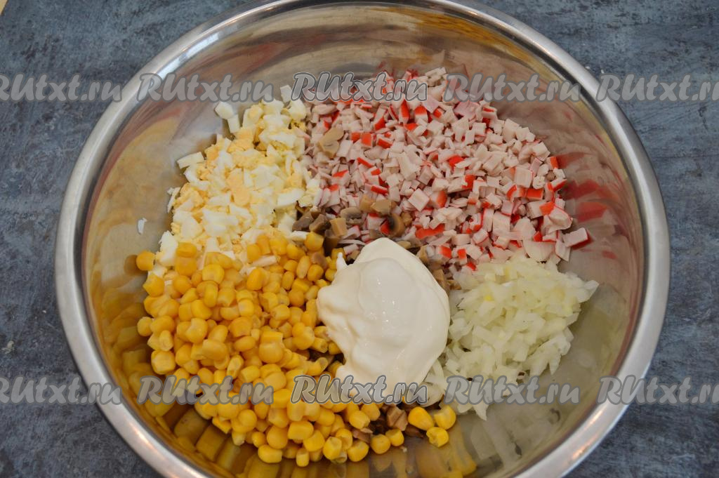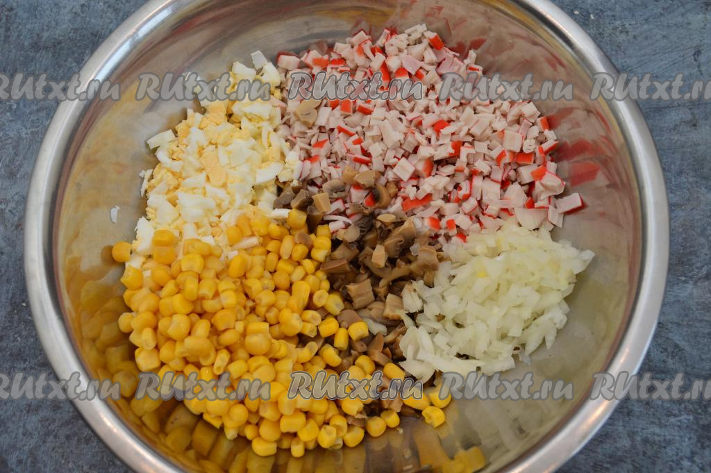 Репчатый лук очистить, мелко нарезать, переложить его в сито, обдать кипящей водой, чтобы ушла лишняя горечь. Оставить лук в сите на несколько минут, чтобы убрать лишнюю жидкость. А затем консервированную кукурузу без жидкости и лук выложить в миску с салатом из консервированных шампиньонов, яиц и крабовых палочек.