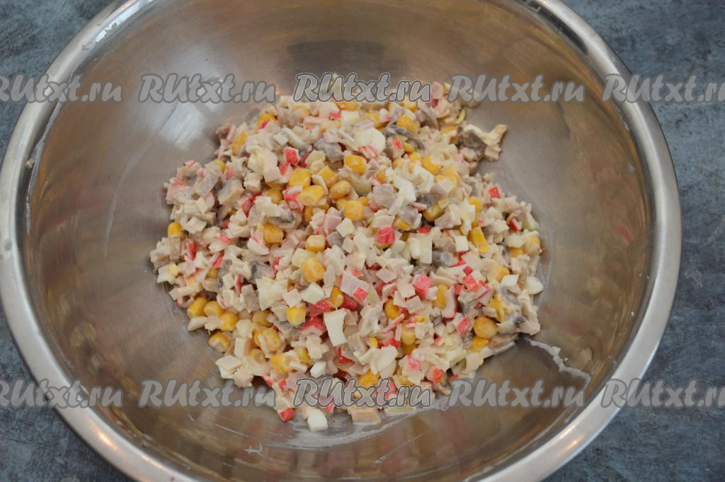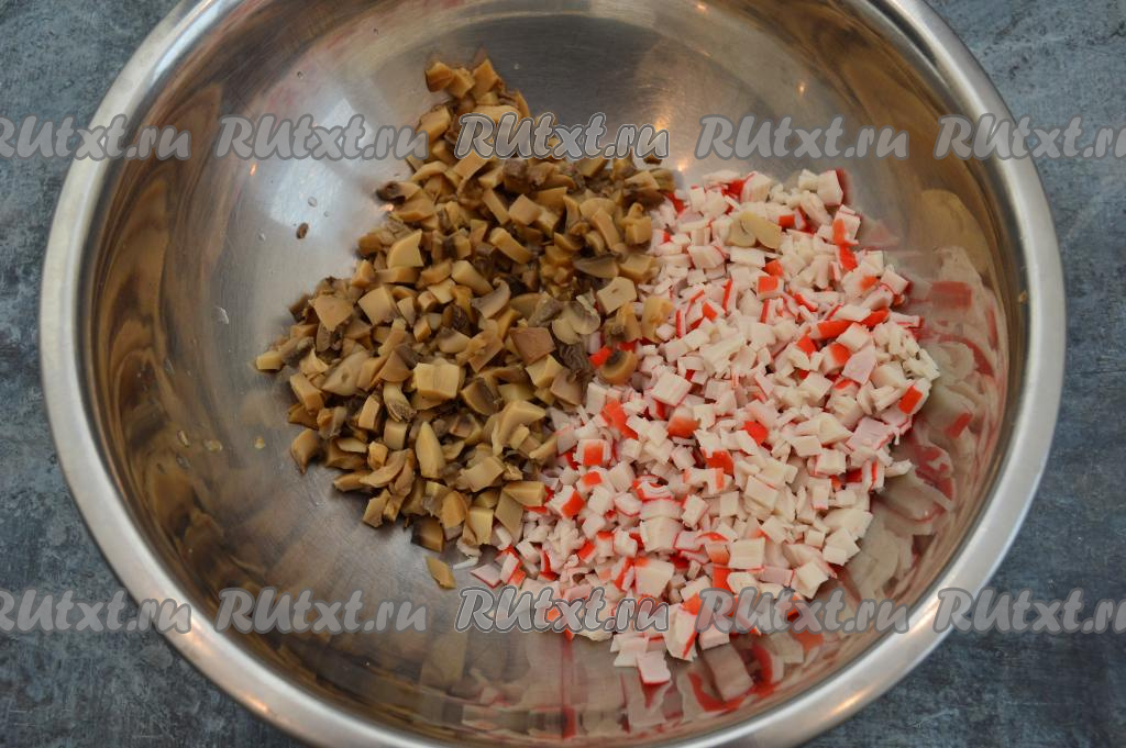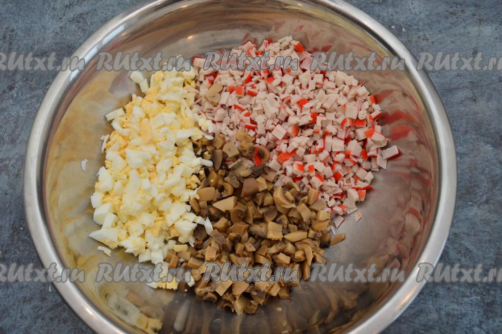 Заранее сварить вкрутую яйца (с момента закипания воды варить 10 минут), после этого полностью их остудить и очистить. Крабовые палочки полностью разморозить при комнатной температуре, затем вынуть их из упаковки. 2 крабовых палочки отложить для украшения. А оставшиеся крабовые палочки нарезать на мелкие кубики, выложить в миску. Консервированные шампиньоны откинуть на сито, чтобы стекла лишняя жидкость, а затем грибы тоже нарезать на мелкие кубики и добавить в миску с крабовыми палочками.