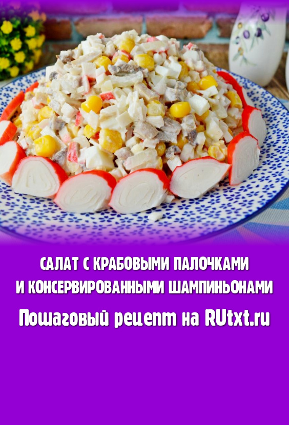 Аппетитный, яркий, достаточно сочный и очень вкусный салат, приготовленный с крабовыми палочками и консервированными шампиньонами, выложить на плоское блюдо (или в салатник), украсить нарезанными крабовыми палочками (или на своё усмотрение) и можно сразу подавать к столу.