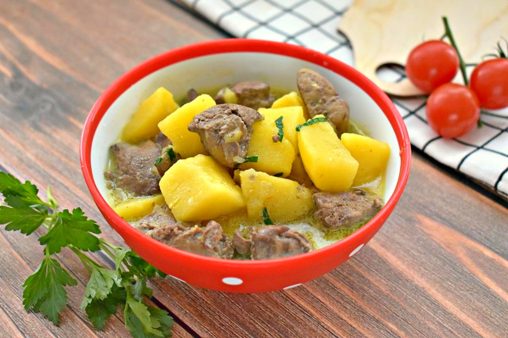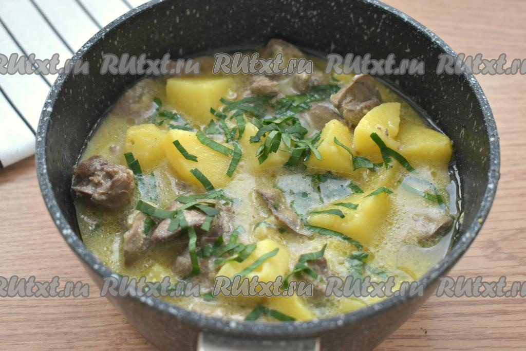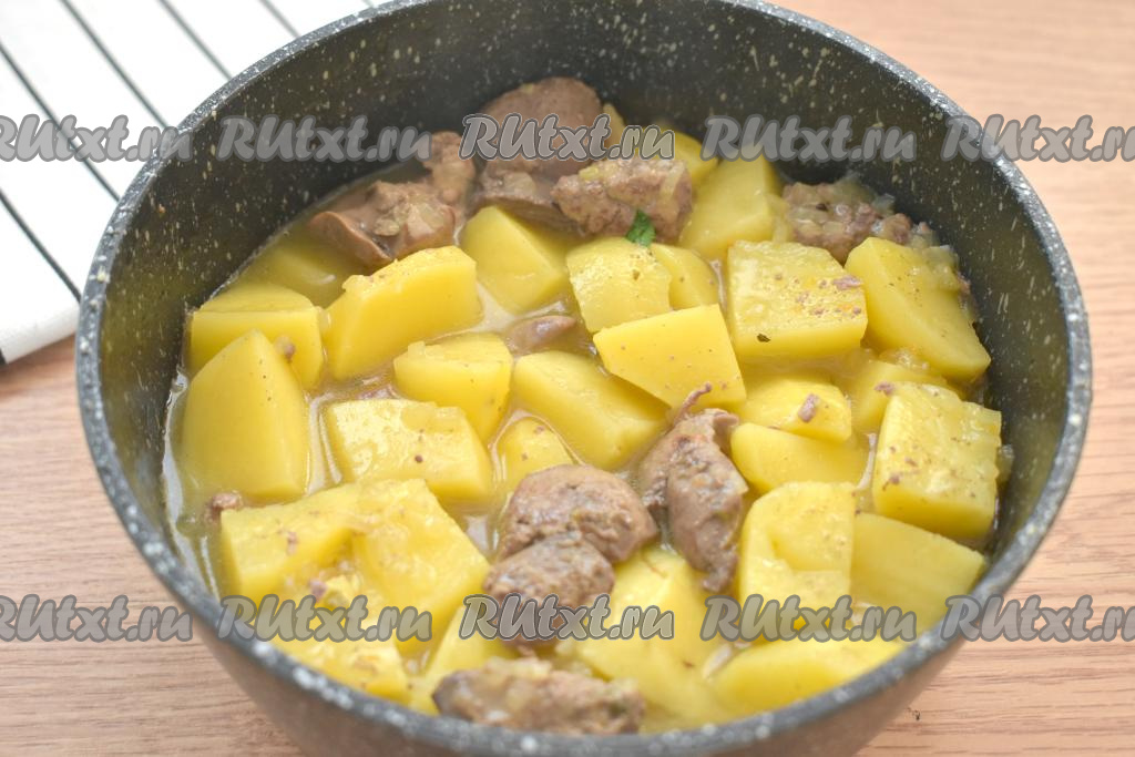 Тушим куриную печень с картошкой под крышкой 25 минут (до мягкости картофеля).
