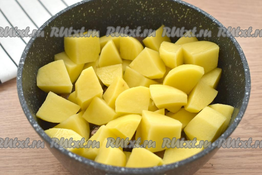 Картошку очищаем, нарезаем на крупные кубики, добавляем к печени с луком.