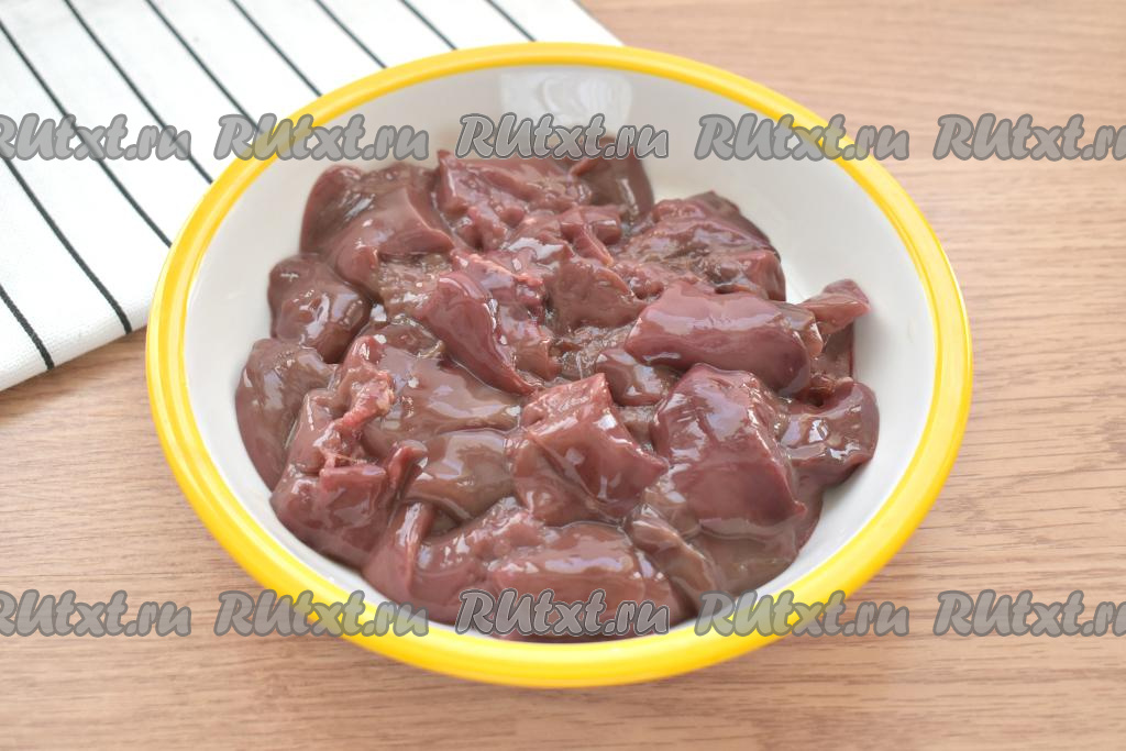Куриную печень промываем под проточной водой, удаляем прожилки. Крупные кусочки печени разрезаем пополам.