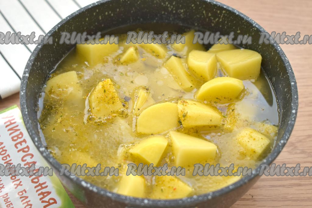 По вкусу солим картошку с куриной печенью, сдабриваем любимыми молотыми специями (я использовала универсальную приправу для разных блюд). Картофель практически полностью заливаем тёплой водой. Даём закипеть воде, убавляем огонь до минимума.
