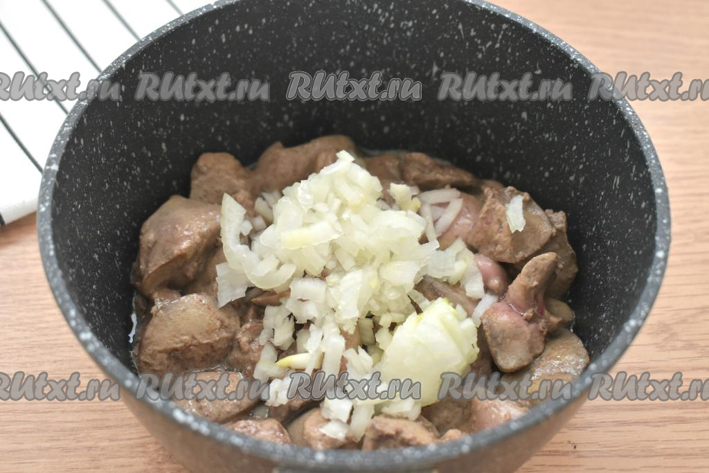 Очищаем репчатый лук, нарезаем его на небольшие кусочки и добавляем к обжаренной печени. Перемешиваем, обжариваем, иногда помешивая, 5 минут.