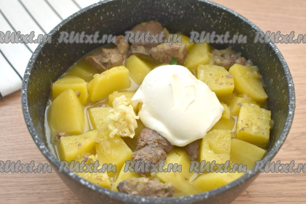После того как картошка станет мягкой, добавляем сметану и мелко нарезанный чеснок. Аккуратно перемешиваем, даём закипеть и тушим картофель с куриной печенью на небольшом огне 5 минут.