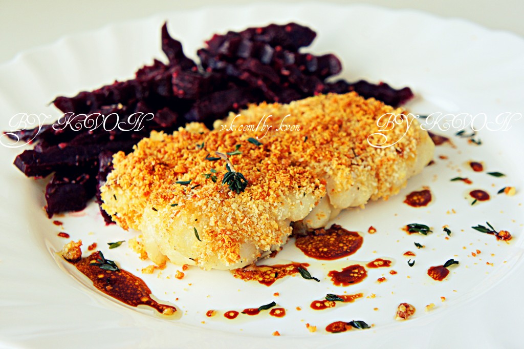 Выпекать филе трески в духовке 15-20 минут до золотистого цвета хлебной крошки. Рецепт предельно прост, а результат получается изумительно вкусным. Подавать рыбку горячей с овощами на ваш выбор. Я подавала с запеченной свеклой.