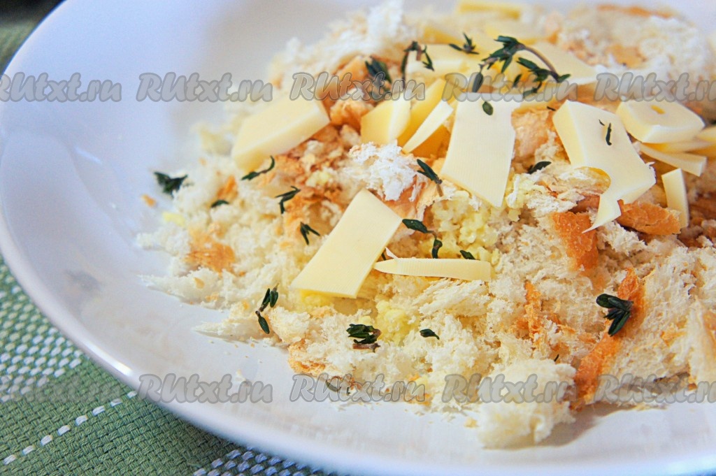 Хлеб поломать на кусочки, чеснок пропустить через пресс, добавить сыр, тимьян, немного соли.
