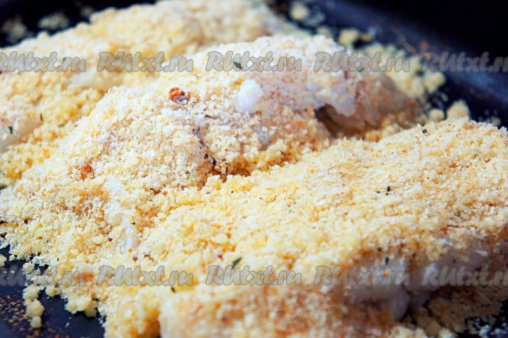 Духовку предварительно разогреть до 200 градусов. Форму сбрызнуть оливковым маслом, выложить обжаренное филе трески в форму. Сверху рыбы выложить приготовленную заранее хлебную "панировку", немного утрамбовать её руками. Рыба со всех сторон должна быть покрыта хлебной "панировкой".