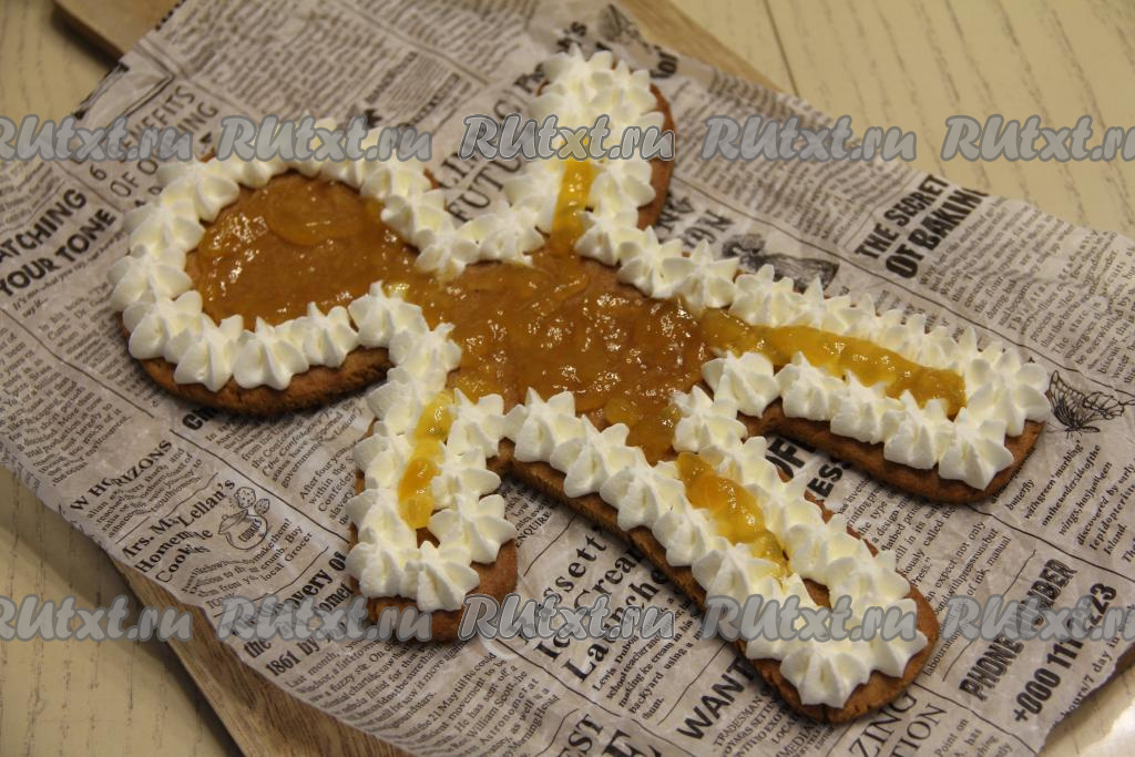 Затем джем отсадить на серединку коржа, на ножки, ручки и голову.