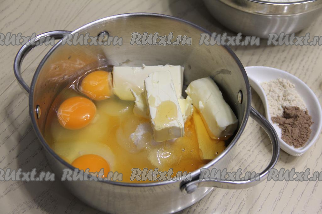 В кастрюле соединить яйца, сахар, мёд, соль и кусочки сливочного масла комнатной температуры.