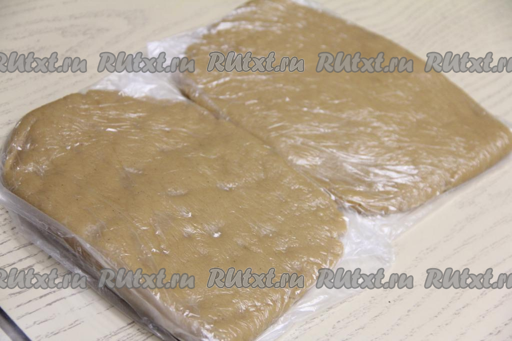 Разделить тесто на две части, поместить в целлофановые пакеты и убрать в холодильник на ночь (или минимум на 5 часов). Я сделала плоские кусочки.