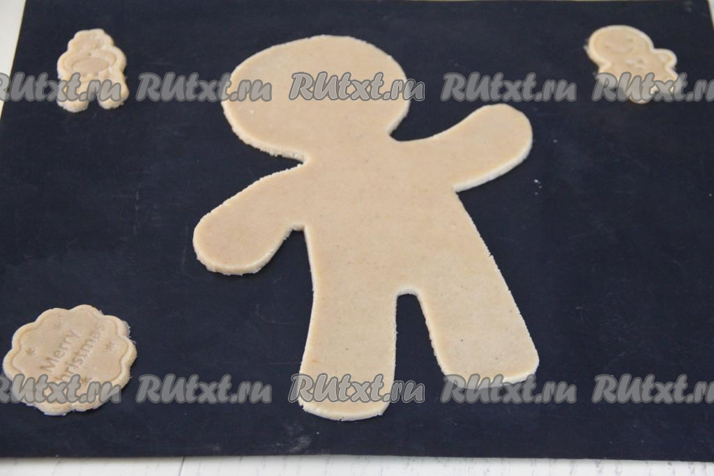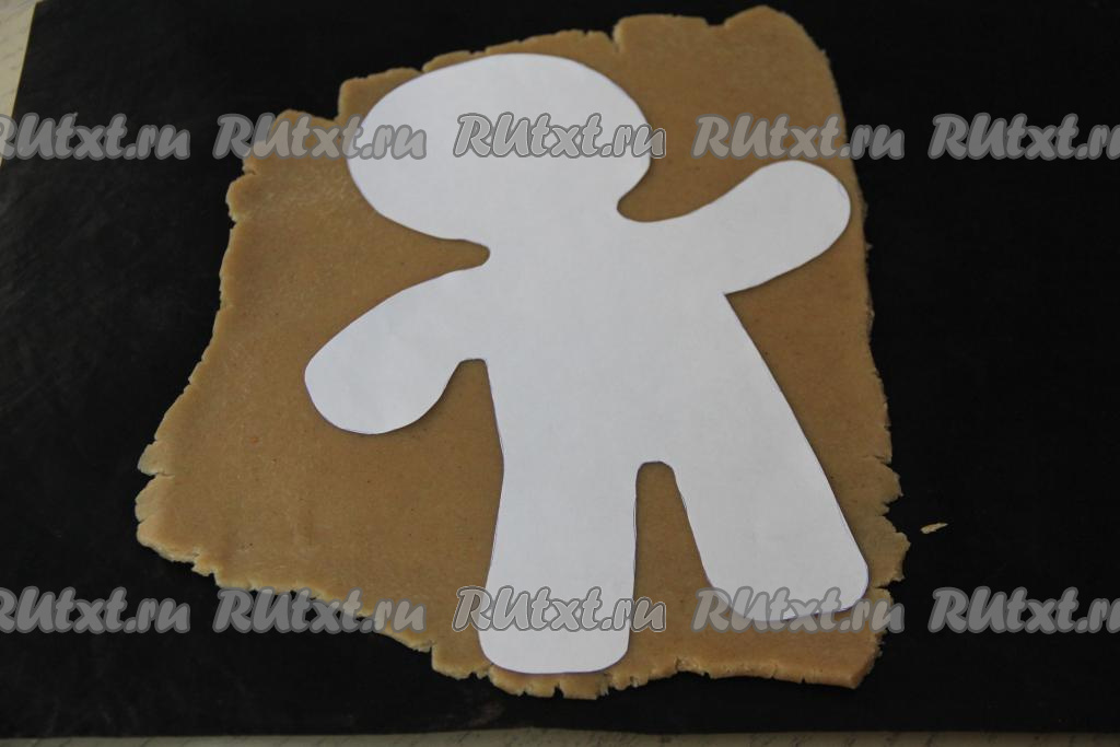 Охладившееся тесто раскатать в пласт толщиной примерно 5 миллиметров. Выложить трафарет на тесто и вырезать человечка. Я раскатывала тесто сразу на коврике для выпечки. Вместо коврика можно использовать пекарскую бумагу.