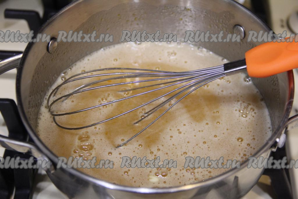 Масса посветлеет и увеличится в объёме. Интенсивно перемешивая, варить масляно-медовую смесь 1-2 минуты на небольшом огне.