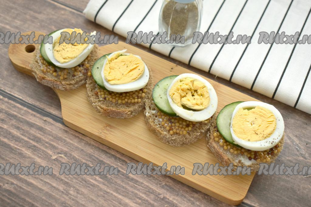 Яйцо нарезаем на кружочки и выкладываем поверх огурца. Яйцо можно немного поперчить.