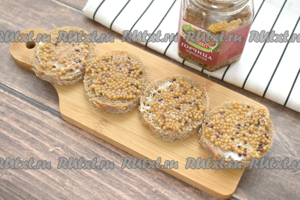 Поверх майонеза кладём зернистую горчицу и распределяем её тонким слоем.