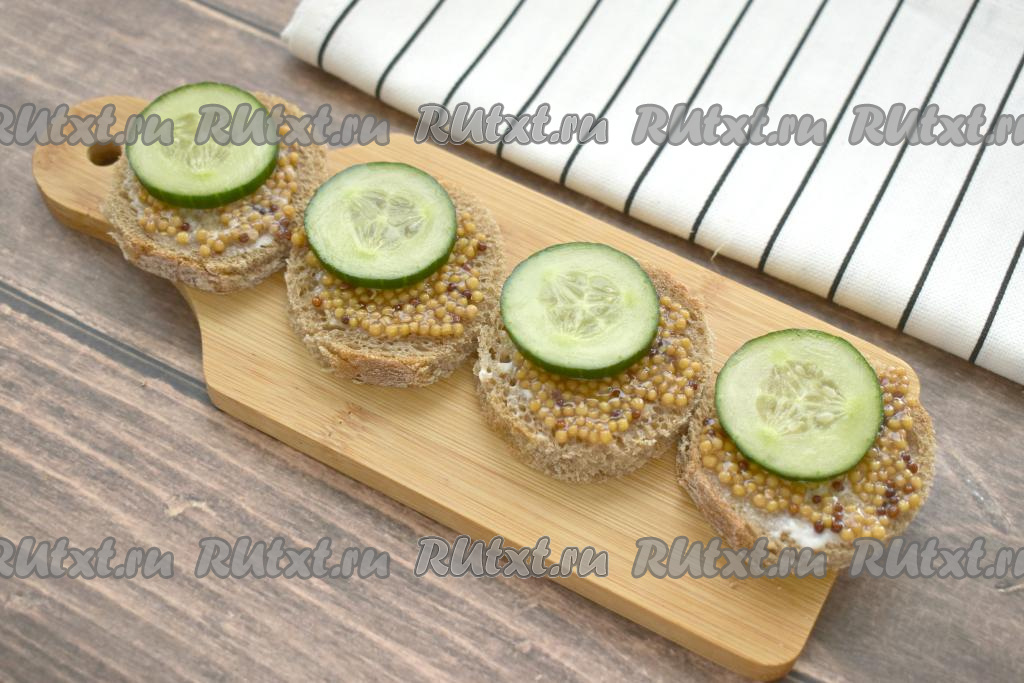 Огурец моем, обсушиваем, нарезаем на тонкие кружочки. По кружочку огурца выкладываем на бутерброды поверх зернистой горчицы. Огурец нужно выкладывать ближе к одному из краёв хлеба, чтобы на хлебе оставалось немного свободного места, на которое в дальнейшем будет выкладываться селёдка.