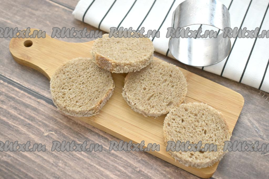 Сварить заранее вкрутую яйцо (в течение минут 10 после закипания воды), затем дать ему полностью остыть и очистить. Заготовки из хлеба (или батона) для бутербродов можно сделать любой формы - квадратной, треугольной, прямоугольной, круглой. Я решила вырезать из хлеба круги с помощью сервировочного кольца диаметром 6,5 сантиметров.