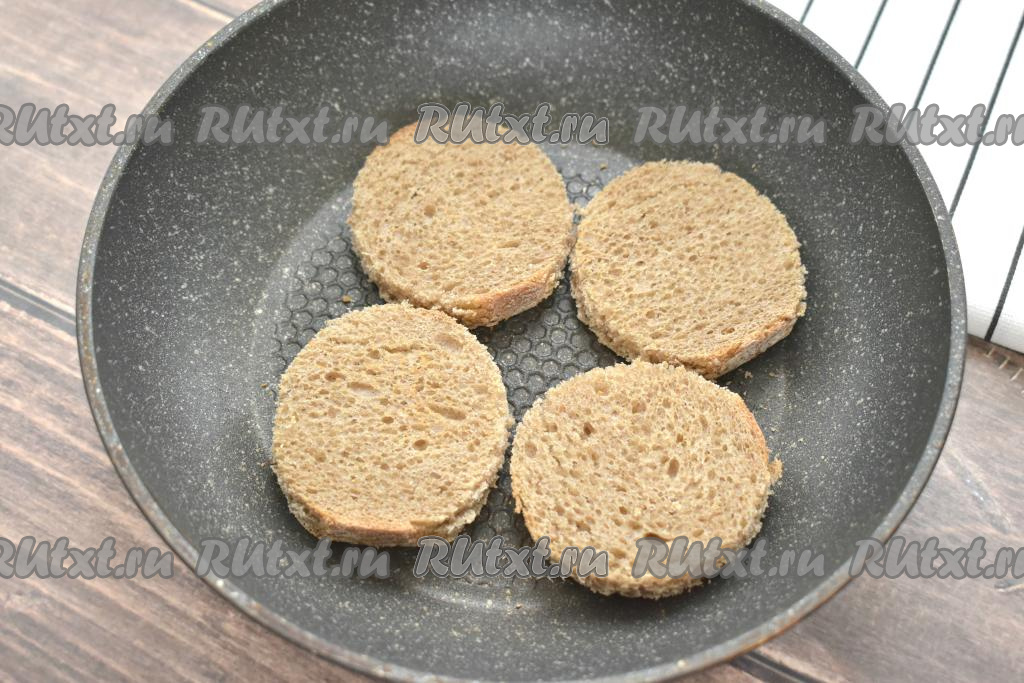 Хлебные заготовки подсушиваем на хорошо прогретой сухой сковороде с двух сторон (примерно по 1 минуте с каждой стороны).