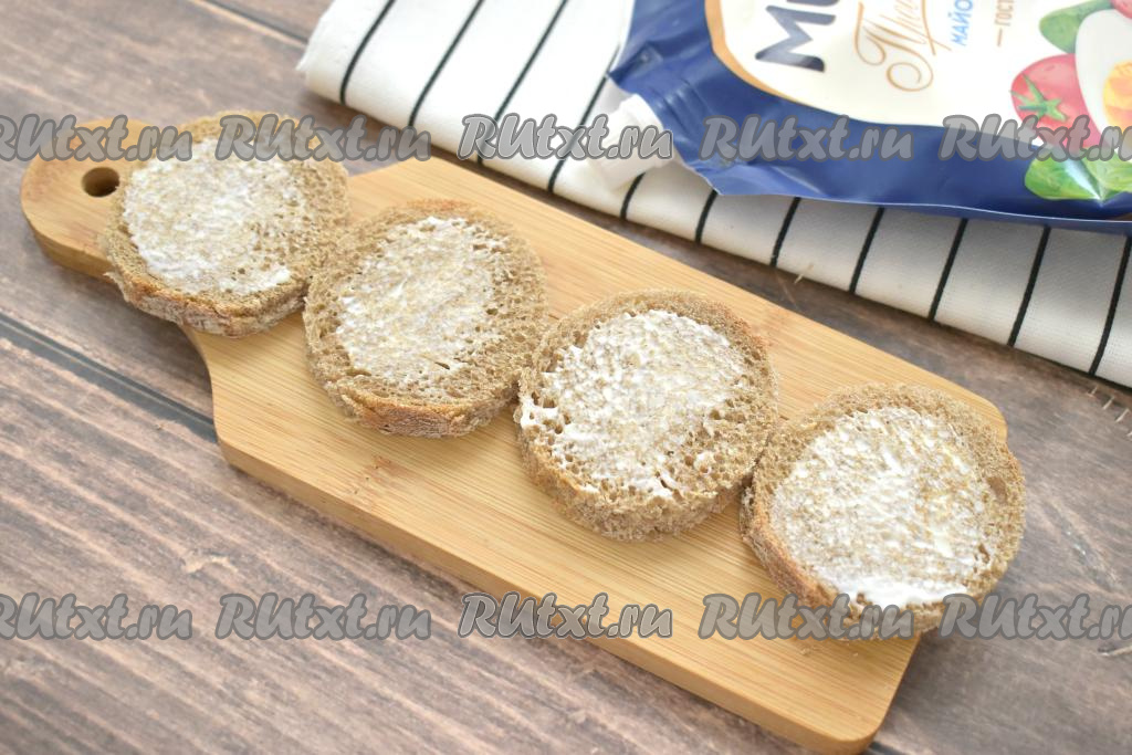 Подсушенный хлеб слегка смазываем майонезом.