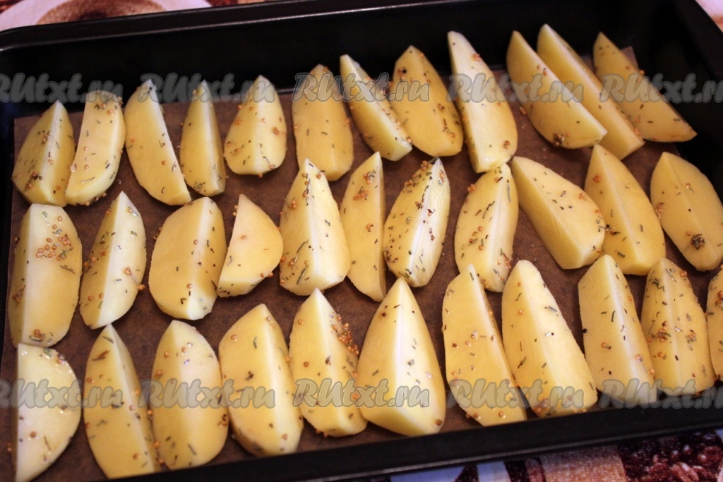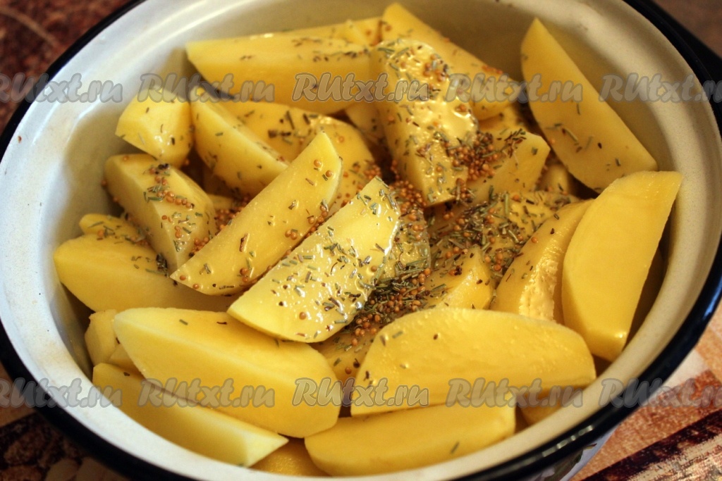 Картофель очистите, нарежьте крупными дольками, посыпьте розмарином и зерновой горчицей, посолите и сбрызните оливковым маслом.