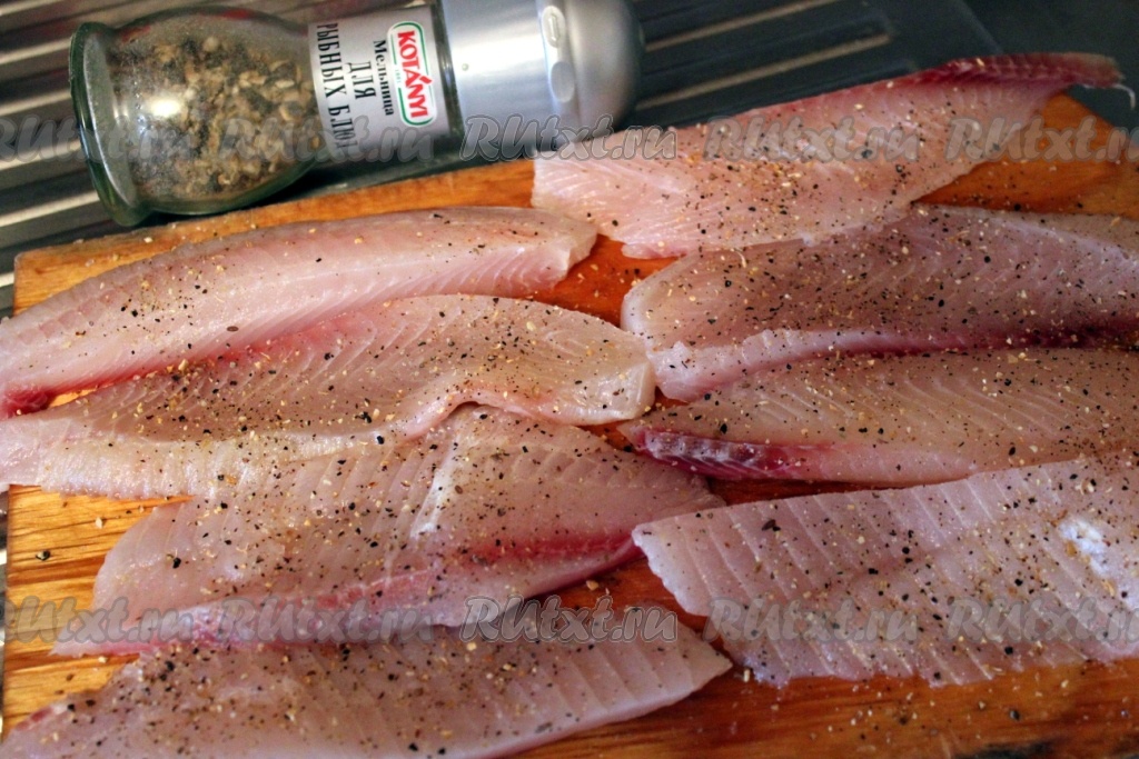 Филе рыбы нарежьте на полоски шириной около 2-3 см, посыпьте специями для рыбы по вкусу (у меня "мельница"), посолите и оставьте на 15 минут.