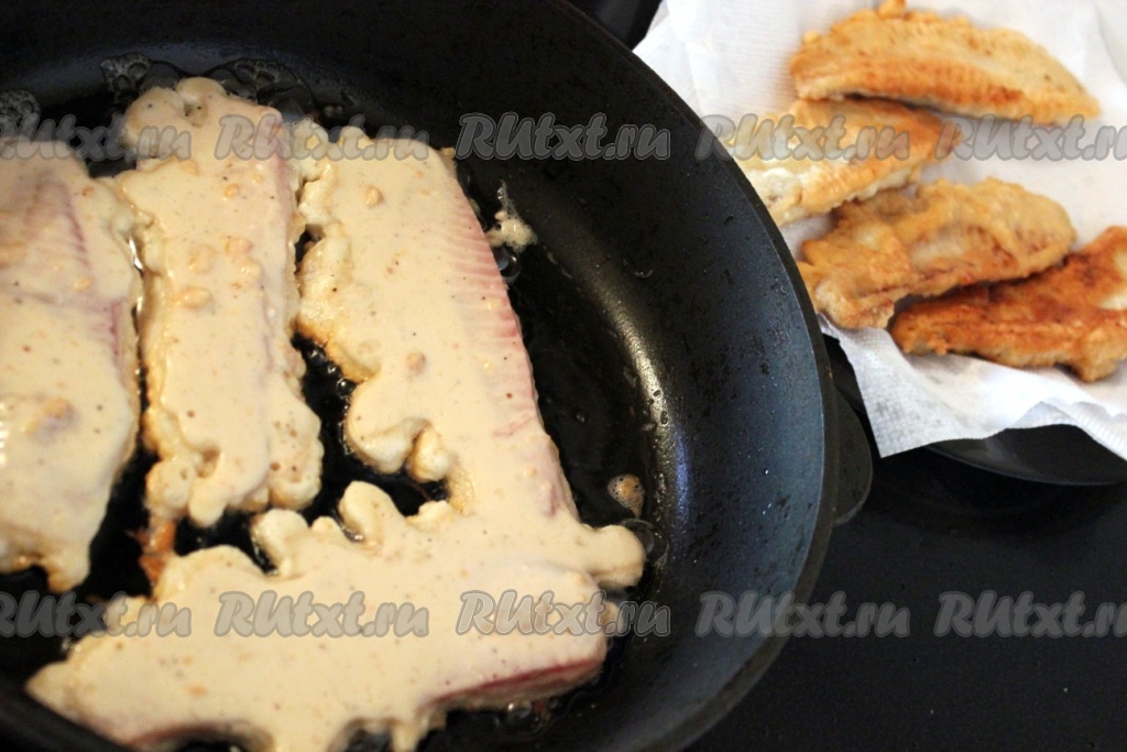 Затем жарьте рыбу с двух сторон на раскаленной сковороде с растительным маслом. Для удаления лишнего масла выкладывайте готовую рыбу в кляре на бумажные салфетки.